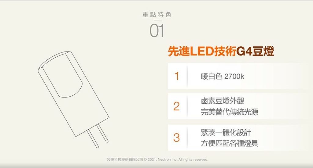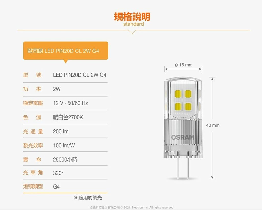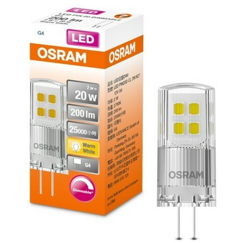 OSRAM LED豆燈 G4 2W 可調光產品規格・尺寸:Ø15 x 40mm・燈頭:G4・額定功率:2W・輸入電壓:12V AC/DC・輸入頻率:50~60Hz・色溫:2700K (黃光)・演色性:Ra ≥80・光通量:200 lm・壽命:25000hrs・可調光產品特色・320°全周光,完美重現鹵素光源效果・緊湊一體劃設計,方便匹配各式燈具・非常適合裝飾與璀璨光芒的應用・長壽高效,有效節省維護成本・高光色一致性(SDCM≤ 6)